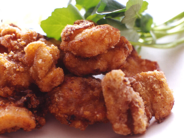 - 【2】【1】の水けをきり、片栗粉をつけてサラダ油で揚げます。
