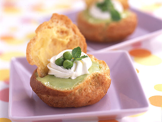 - 【7】生地が冷めたら上部1/3ほどを包丁でカットし、下部分に【4】のグリンピースのクリームを絞り、飾り用のホイップクリームを絞ります。上部のシュー皮をのせ、グリンピース、ミントの葉を飾りつけます。