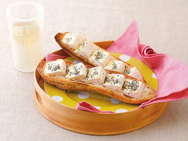 - 【1】パンは縦半分に切ります。カマンベールチーズは10等分のくし形に切ります。