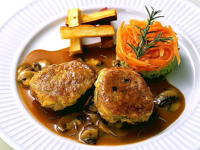 - 【4】器に【1】のつけ合わせを盛りつけ、【3】のソースを敷き、ソースの上に【2】の豚肉を盛りつけ、あればフレッシュのローズマリーを飾ります。