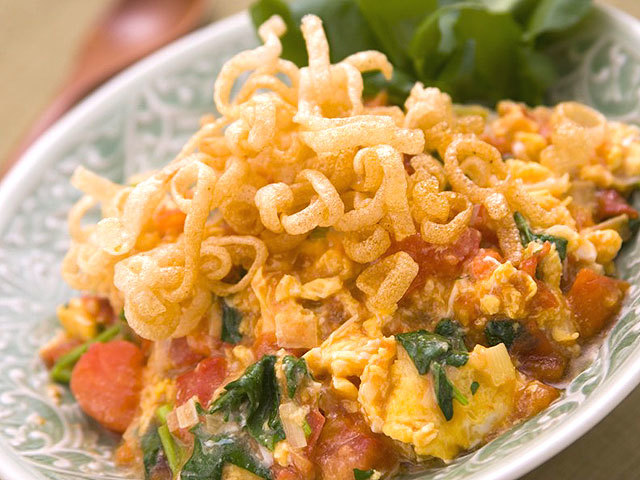 - 【2】フォーは熱したサラダ油でかりっと揚げて、キッチンペーパーに取り、軽く砕きます。
