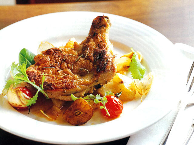 - 【4】フライパンにオリーブオイルを入れ、肉を皮のほうから焼きます。焼き目がついたら返して身のほうもさっと焼きます。天板に焼き汁ごと移し、180度のオーブンでじゃがいも、にんにくも入れて約10分焼きます。じゃがいも、にんにくがやわらかくなり、肉に火が通ってパリッとなったら肉、じゃがいも、にんにくを温めた器に取り出してアルミホイルをかけて保温します。