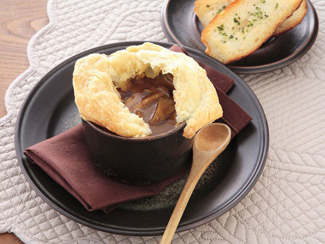 - 【3】ココット型等に【1】のカレーを入れ、【2】のパイシートをかぶせて、ふちを押しつけるようにしふたにします。