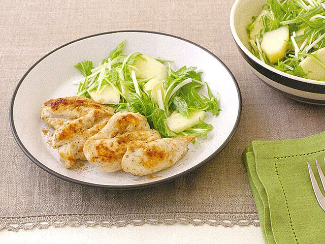 - 【4】水菜は3cm長さに切り、【1】を加えて混ぜます。【3】とともに皿に盛り、お好みでコリアンダーを振ります。(分量外)