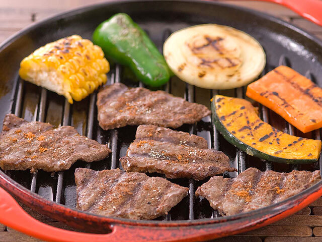 - 【1】牛肉にお好みのスパイス類を振りかけ、薄く切った野菜と一緒に焼きます。