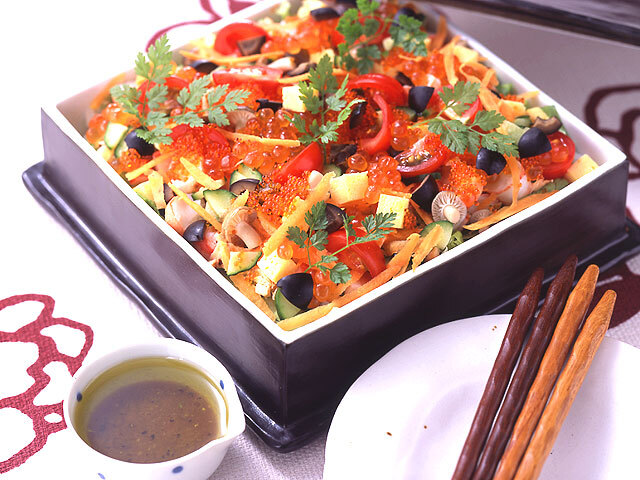 - 【1】えびはゆでて3等分にし、鮭は焼いてほぐし、かにかまぼこは1cmに切ります。レタス、にんじんはせん切りに、きゅうりは縦四つ割の小口切りに、ミニトマトは6等分にし、しめじは石づきを取り小房に分けてゆで、オリーブは8等分にし、卵焼きは1cmの角切りにします。