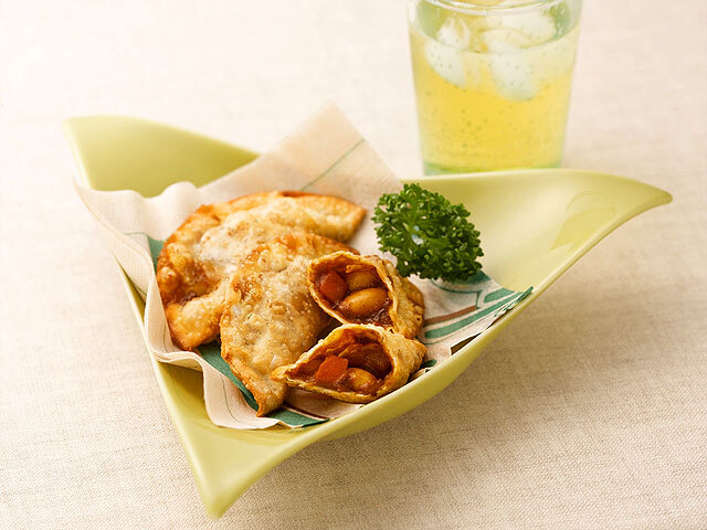 - 【3】カレーを冷ましたら、ギョーザの皮に【2】を適量を包んで口をしっかり閉じ、160-170度の油で揚げます。