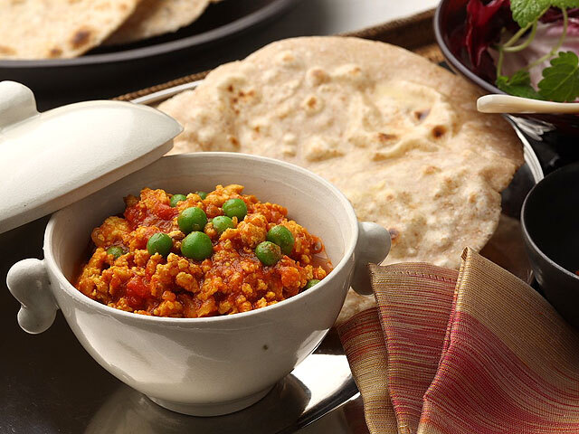 - 【5】カレーは汁けが少なくなる程度まで煮込めば完成です(約15分)。最後にグリンピースを散らして器に盛り、チャパティーをちぎってつけながら食べます。