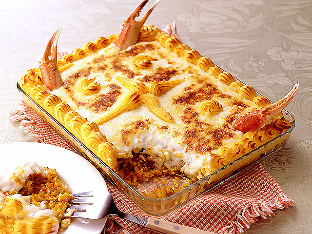 - 【4】器にバター(分量外)を塗り、【3】を敷き詰めます。器のまわりにマッシュポテトを絞り、【1】のベシャメルソースを流し、おろしたチーズを散らします。