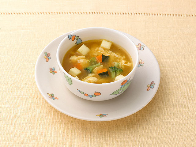 - 【2】小鍋に水100mlとかぼちゃ、ブロッコリーを入れてやわらかくなるまで煮ます。はんぺん、豆腐とカレーを加えて少し煮て、最後に溶き卵を回し入れます。