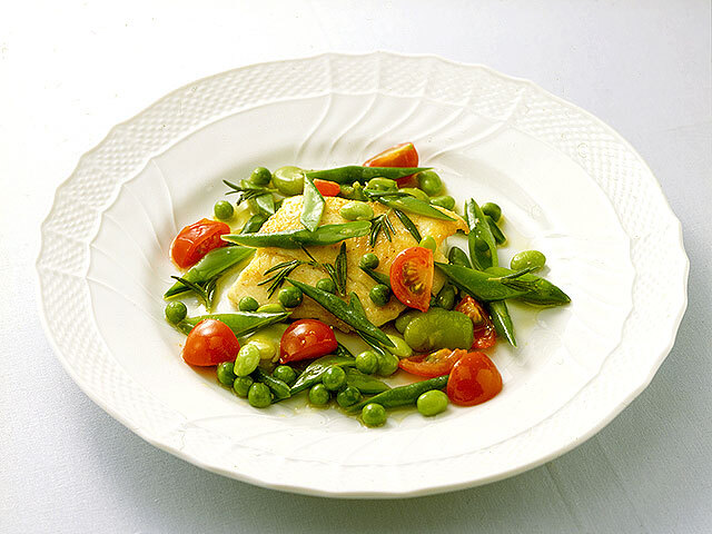 - 【2】鯛に塩、ホワイトペッパーで下味をつけます。フライパンにオリーブオイル大さじ1、にんにく、ローズマリーを入れて火にかけ、香りが立ってきたら鯛を入れて両面焼きます。白ワインを加えてアルコールをとばし、鯛を皿に盛りつけます。