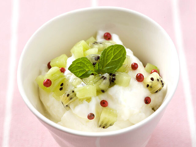 - 【2】フルーツを食べやすい大きさに切り、【1】と合わせ、スペアミントとピンクペッパーを飾ります。