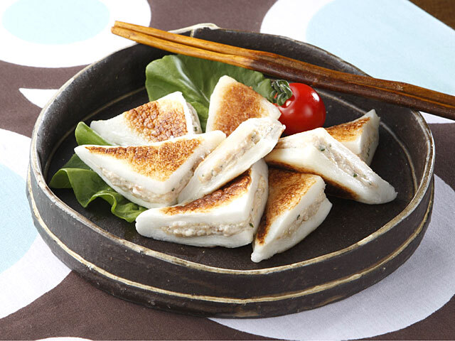 - 【2】鶏ひき肉とパセリ、おろししょうが、ブラックペッパーと水少々(分量外)を混ぜ、8等分し、はんぺんに挟みます。耐熱容器に並べて軽くラップをし、電子レンジ(600W)で約1分30秒加熱します。