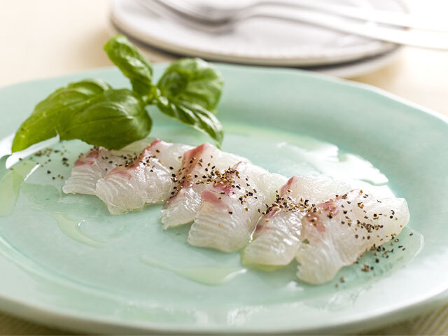 - 【3】【2】から鯛を取り出し、薄く切ってオリーブオイル(レモンの絞り汁でも可)、ブラックペッパーをかけます。皿に盛り、バジルを添えます。
