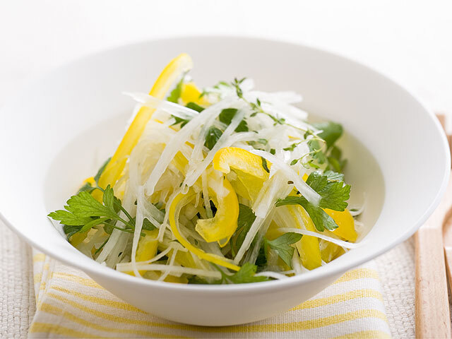 - 【1】大根、パプリカはせん切りにします。フレッシュのタイム、イタリアンパセリは葉を摘みます。