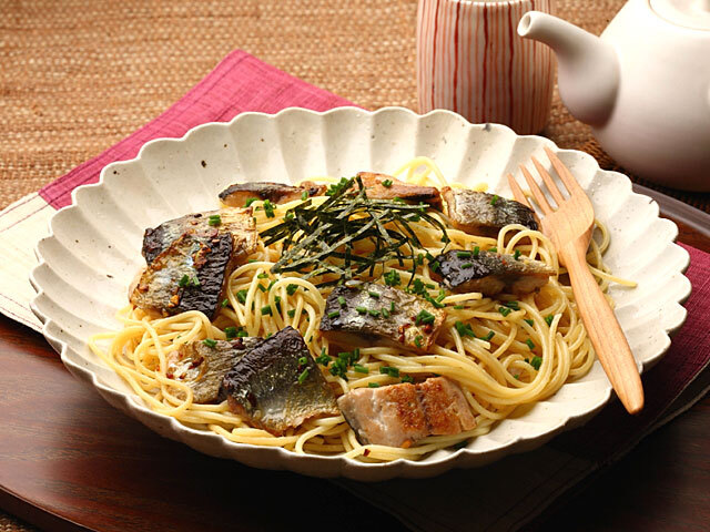 - 【1】さんまは頭と内臓を取り、三枚におろして、腹の小骨を包丁でそぎ取ります。身をそれぞれ5-6等分の食べやすい大きさに切り分けておきます。スパゲッティは、たっぷりの湯に塩(分量外)を加え、パッケージの表示時間通りにゆで始めます。