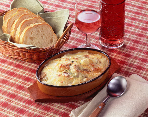- 【4】フライパンにバターを熱し、鶏肉、玉ねぎ、マッシュルームを炒め、栗とともにバター(分量外)を塗ったグラタン皿に入れ、【3】をかけ、ピザ用チーズをのせオーブンで焼き、パセリを散らします。