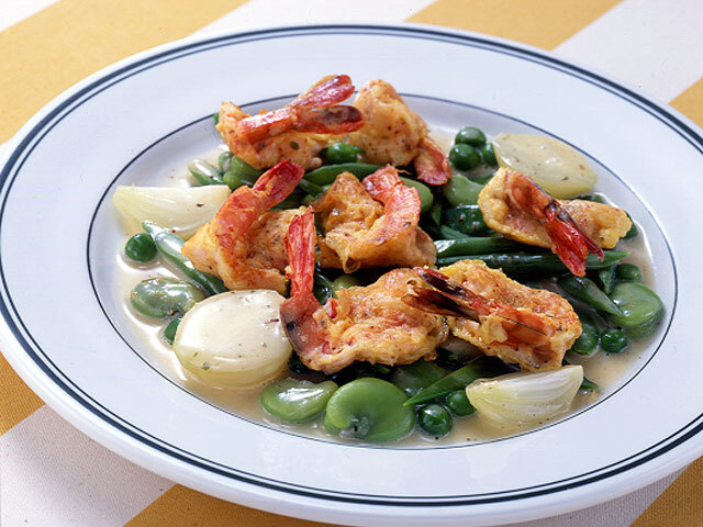 - 【3】野菜は塩ゆでし、絹さや、さやいんげんは斜め切り、ペコロス(小玉ねぎ)は四つ割りにし、鍋に水、バターを煮て、野菜を入れて軽く煮て、塩、ホワイトペッパーで味を調え、皿に盛りつけ、小えびをのせます。