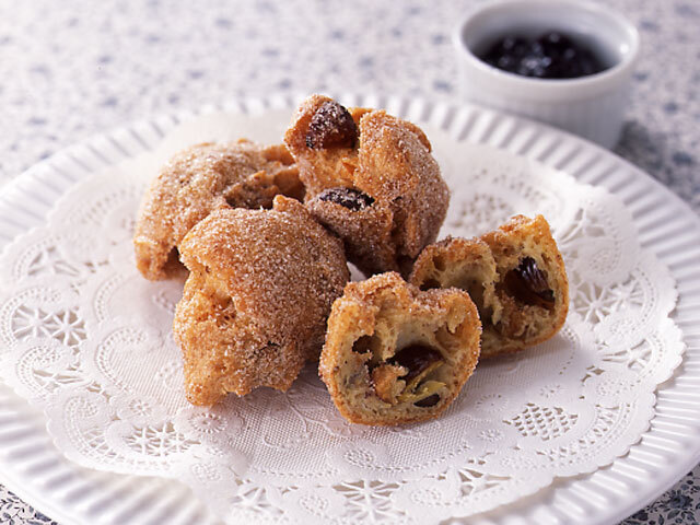- 【4】160度の油にスプーンで生地をすくって入れ、上下返しながら揚げます。油をきって、シナモンシュガーをまぶし、ブルーベリージャムを添えます。