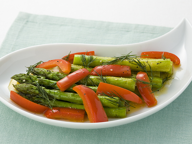 - 【2】フライパンにオリーブオイルとおろしにんにくを入れて火にかけ、香りが出たら、アスパラを炒め、続いてパプリカを加えて炒め、塩を加えます。火からおろし、オリーブオイルごとバットに移します。