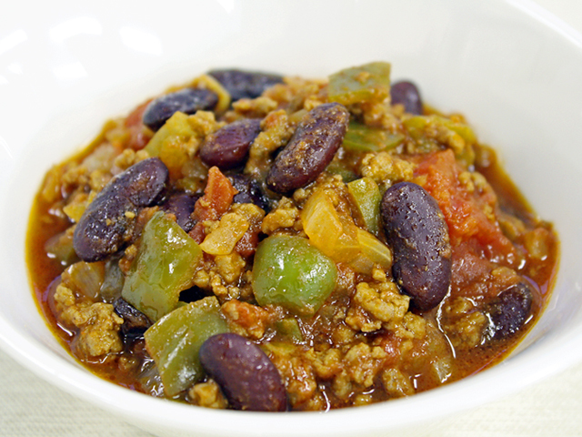 - 【2】鍋にサラダ油を熱し、牛ひき肉、玉ねぎ、ピーマンを炒めます。トマトの水煮を加えて木ベラで軽くつぶし、キドニービーンズ、シーズニングを加えて15分ほど煮込みます。