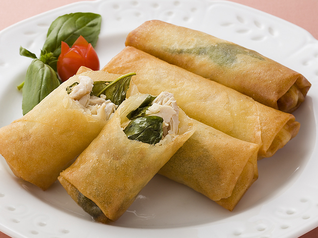 - 【2】春巻の皮にバジルの葉を敷き、ささみをのせ、チューブ梅を塗り、しっかり巻きます。【A】でのりを作り、巻き終わりに塗ってしっかり留めます。