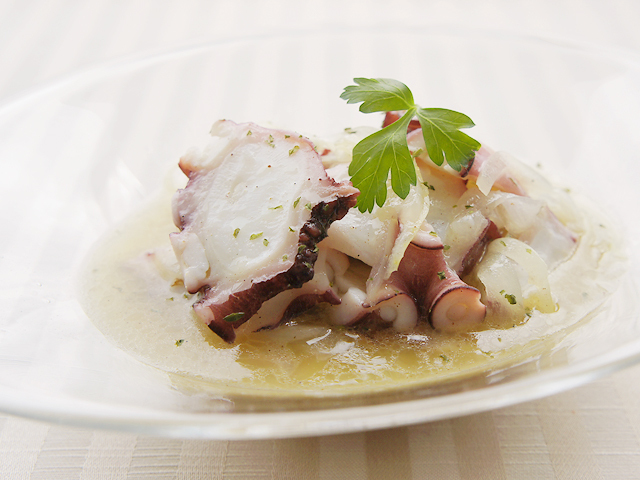 - 【3】【2】にたこを加えて混ぜ、白ワインビネガー、ホワイトペッパー、ディルシード、塩を加えてさらに混ぜ、パセリを振ります。