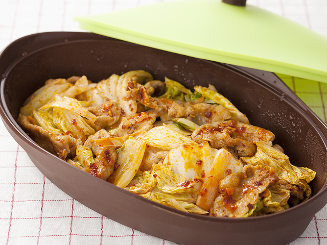 - 【3】シリコンスチーマーに【2】を入れ、電子レンジ(600W)で3分加熱し、全体を軽く混ぜ、さらに2分加熱します。