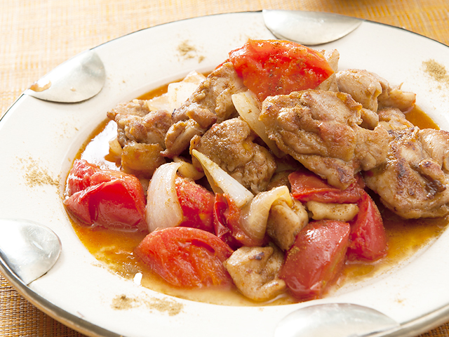 - 【1】鶏肉は大きめの一口大に切り、【A】をもみ込みます。玉ねぎは一口大のくし形切りに、トマトは一口大の乱切りにそれぞれ切ります。