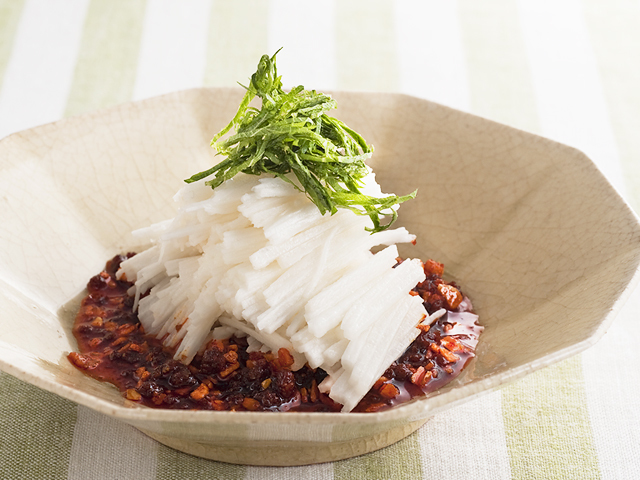 長芋をせん切りにして、おかずラー油で和えます。長芋のしゃきしゃき、とろりとした食感とおかずラー油がよく合います。