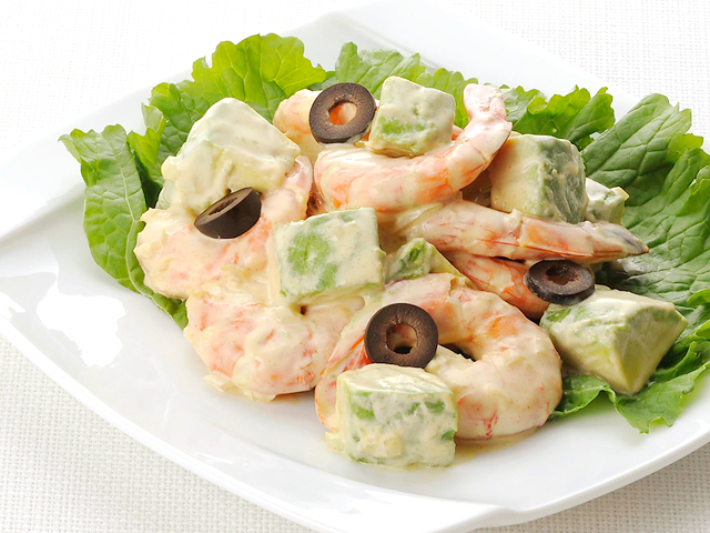 - 【2】【1】を【マスタードケチャップソース】とマヨネーズを混ぜたもので和え、サニーレタスなどを敷いた器に盛り、薄切りにしたブラックオリーブを飾ります。