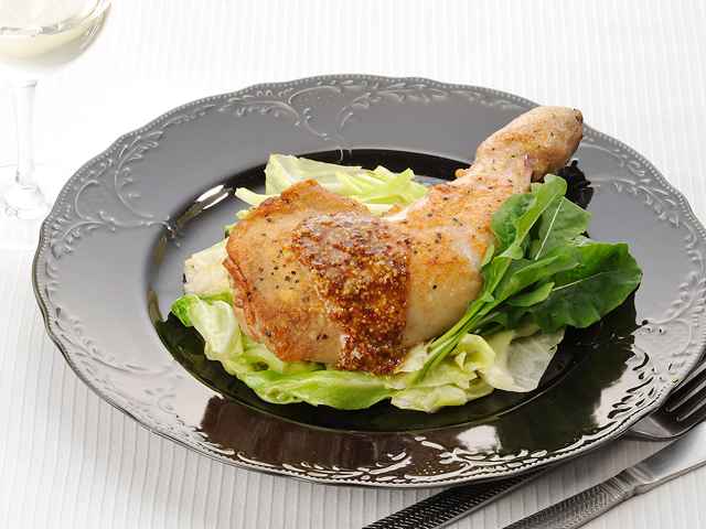 - 【4】炒めたキャベツの上に鶏肉を盛り、【マスタード醤油だれ】の材料とおろししょうがを混ぜ合わせたソースをかけ、ルッコラを添えます。