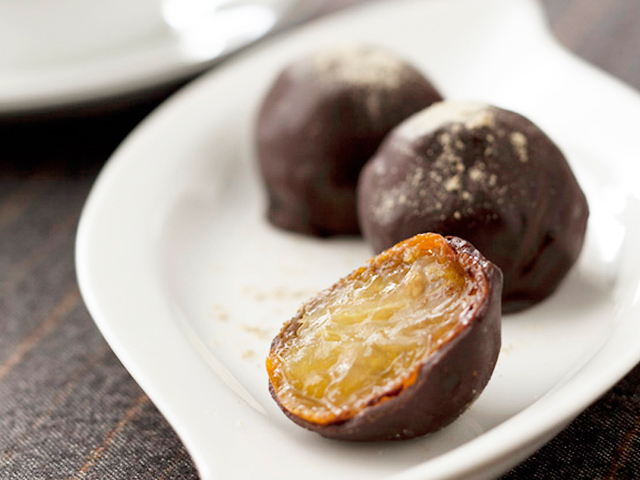 - 【2】チョコレートを湯煎にかけて溶かし、【1】にコーティングします。チョコレートが乾いたら、カルダモンを上から少々振りかけます。