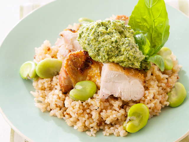 - 【4】器に玄米ご飯を盛り、【3】とそら豆をのせて【2】をかけ、スイートバジルの葉を添えます。