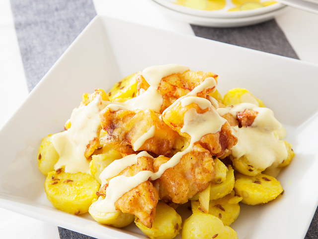 - 【4】しょうがはせん切りにし、フライパンにサラダ油大さじ1、クミンシードとともに入れて中火にかけ、香りが立ったら鷹の爪、塩、ターメリックの順に加えて混ぜ、火を止めて【3】のじゃがいもを加え、和えます。めかじきと盛り合わせ、【C】の材料を混ぜ合わせてかけます。