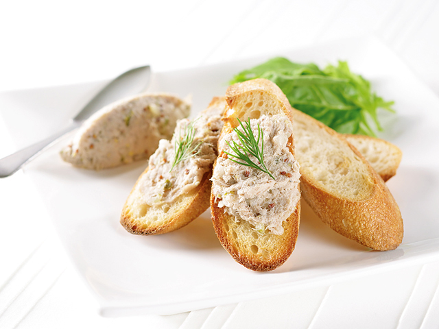 - 【4】【3】にコルニッション、マスタード、塩、コショーを加えて味を調え、ディル、バケットを添えます。