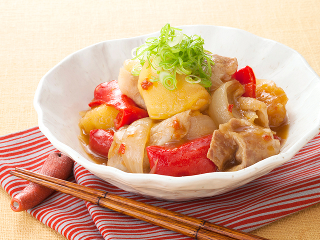 - 【1】豚肉は3等分に切ります。じゃがいもはひと口大、玉ねぎはくし形切り、赤ピーマンは4つ割りにします。