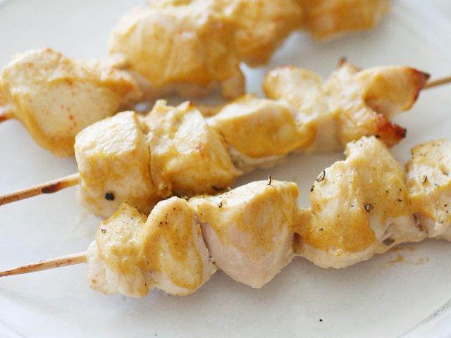 - 【2】【1】を竹ぐしに3-4個刺し、200度に温めたオーブンで12分焼き、ディジョンマスタードを刷毛で塗ります。
