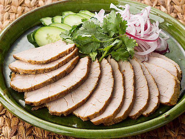 - 【3】残りのコリアンダーを全体に振り、強火で煮汁をからめます。肉を取り出し、玉ねぎと煮汁をザルでこして肉にかけてまぶします。そのまま冷まし、粗熱が取れたら切り分けます。