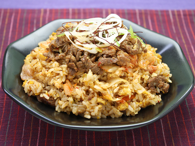 - 【4】【3】に溶き卵を加え、半熟状になったら、白飯を加えて炒めます。白飯がパラリとしたら皿に盛りつけます。