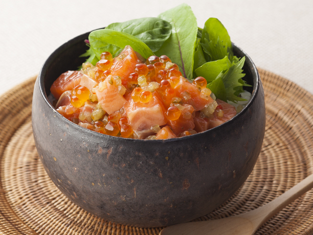 - 【2】器に、【1】のご飯を盛り、上にベビーリーフと【1】のサーモンとイクラをのせます。