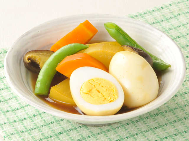 - 【4】鍋に【A】を入れ、【1】の大根、にんじん、【2】の卵、【3】のしいたけを加え、弱火で約5分煮ます。