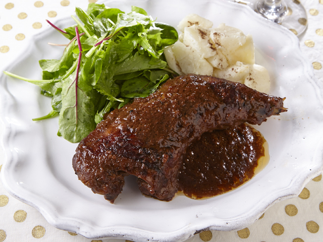 - 【4】フタを取り【1】のつけ汁を入れ、5~10分間煮詰めて器に盛り、煮汁をかけます。【2】と、ドレッシングで和えたベビーリーフを添えます。