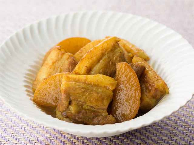 - 【2】鍋にサラダ油を熱して豚肉を炒め、色が変わったら大根を加えて全体に油がまわる程度に炒めます。