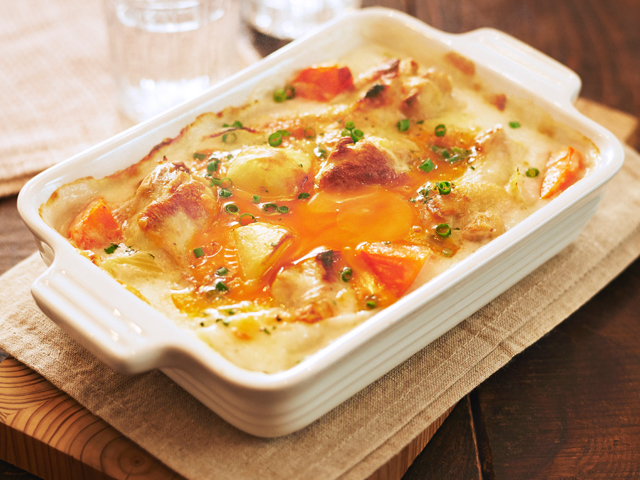 クリームシチューに卵黄がとろ~りからまる濃厚な味わい。香味野菜とフレッシュハーブのアクセントが絶妙。オーブンで焼いてグラタン風に仕上げます。