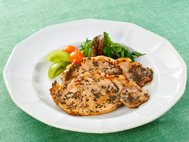 - 【1】豚肉は脂と赤みの間の筋に、数か所包丁を入れてスジを切ります。塩とブラックペッパーをふり、ミントを全体にふって手で軽く抑えます。