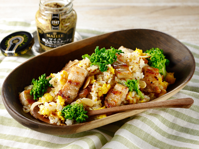 - 【4】【3】のフライパンに温かいご飯、菜の花、【A】を加え炒めます。