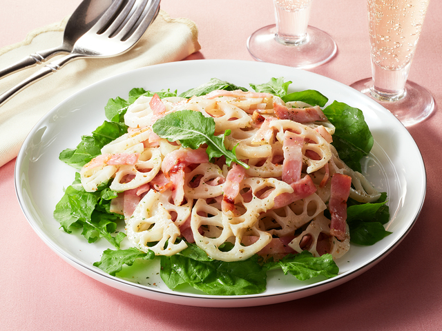 - 【1】ルッコラは洗って3-4㎝幅に切り、水にさらしてパリッとさせます。れんこんは皮をむき、2-3㎜厚さの薄切りにし(輪切りまたは半月切り)、酢水(分量外)にさらします。ベーコンは1㎝幅に切ります。
