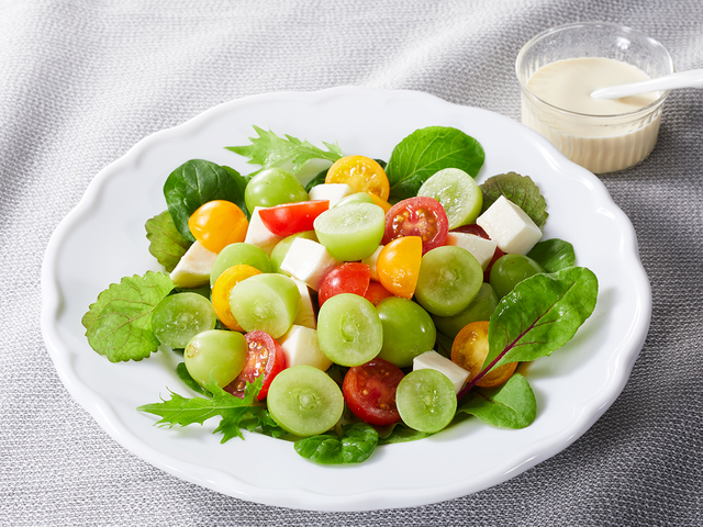 - 【2】ぶどう、ミニトマトは横半分に切り、モッツァレラチーズは2㎝角に切ります。