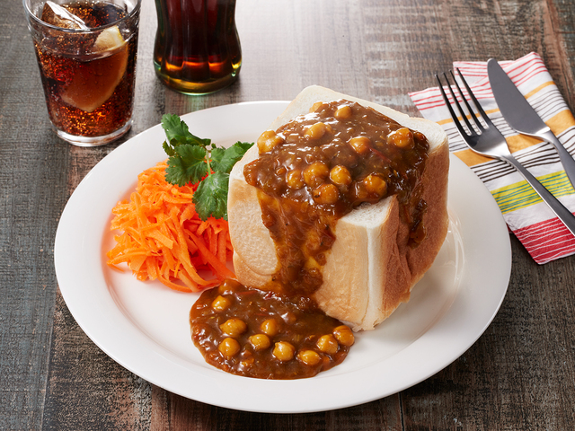 - 【6】くりぬいた食パンの中に【4】を詰め、にんじんのサンバルを添えます。お好みでパクチーを添えます。